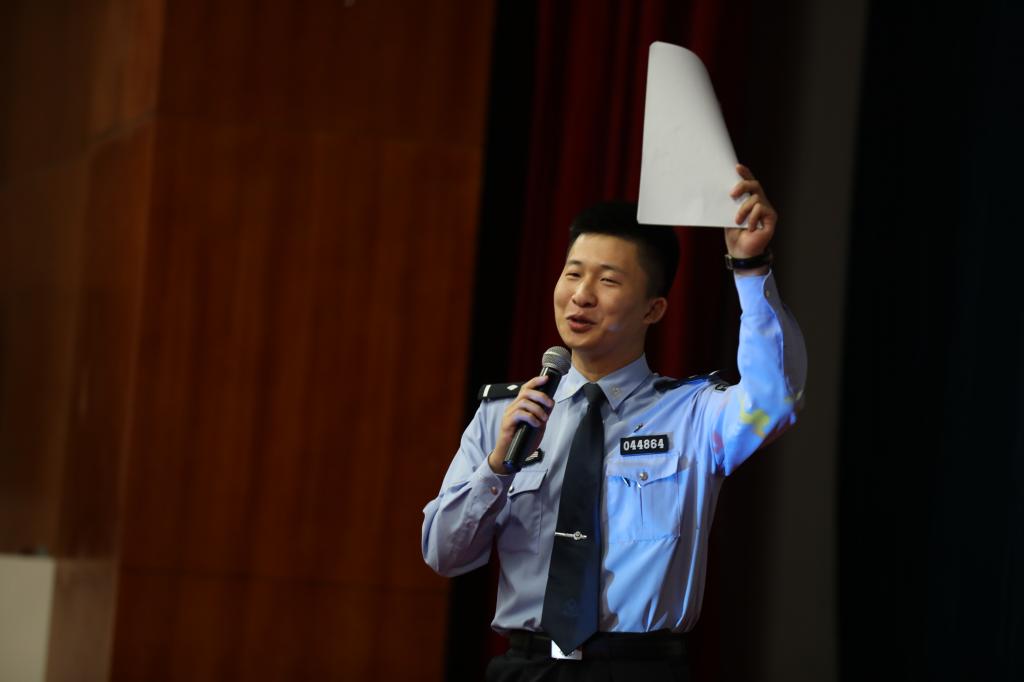 平安莱山宣讲团李毅然补充介绍了网络贷款、网络刷单、网络游戏类诈骗,并现场模拟诈骗场景,加深学生对诈骗手段的了解。他希望同学们能够树立正确的金钱观和消费观,不能抱有“轻轻松松就能赚钱”的心理。