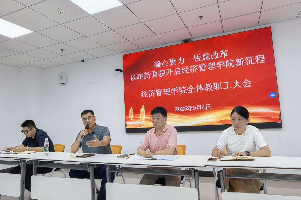 近日,经济管理学院在S209会议室隆重召开新学期工作部署大会。会议系统总结了上半年学院各项工作成效,并就新学期重点任务作出全面部署。学院领导班子及全体教职工参会,共同谋划新发展、凝聚新共识。